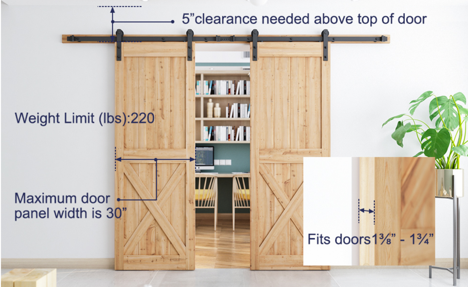 - Ajuste puerta Panel: 36"; Ancho puerta Panel Grosor: 1 3/4 8" y 1 3/4";