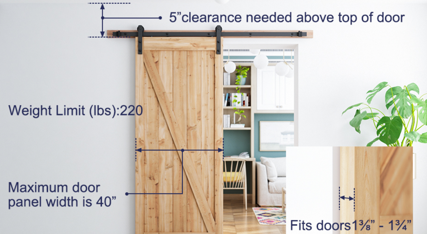 - Door weight capacity: 220 lb, Fit door panel width: 36"-40", Fit door panel thickness: 1 3/8" and 1 3/4".